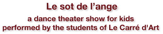 June 16 and 17, 1995, 7pm, June 18, 5pm Notre histoire débute par une nuit de pleine lune, lorsqu’un étrange personnage ailé et tout vêtu de blanc, surgie du noir. Pendant que les enfants dorment sur leurs oreillers dodus, plongés dans leurs rêves, un ange descend du ciel… Maison du Renard Prêchant 7 rue des Balayeurs, Strasbourg, entrée libre Choreography, scenography, costumes Irena Tatiboit Theater training Françoise Ferhati Administration Christiane Mehani Public relations Chantal Bolenor Song of the angel lyrics Françoise Ferhati, music Hubert Dennefeld Making of costumes Géraldine Super, Emmanuelle Moser, Delphine Gall, Brigitte Kuntzmann |